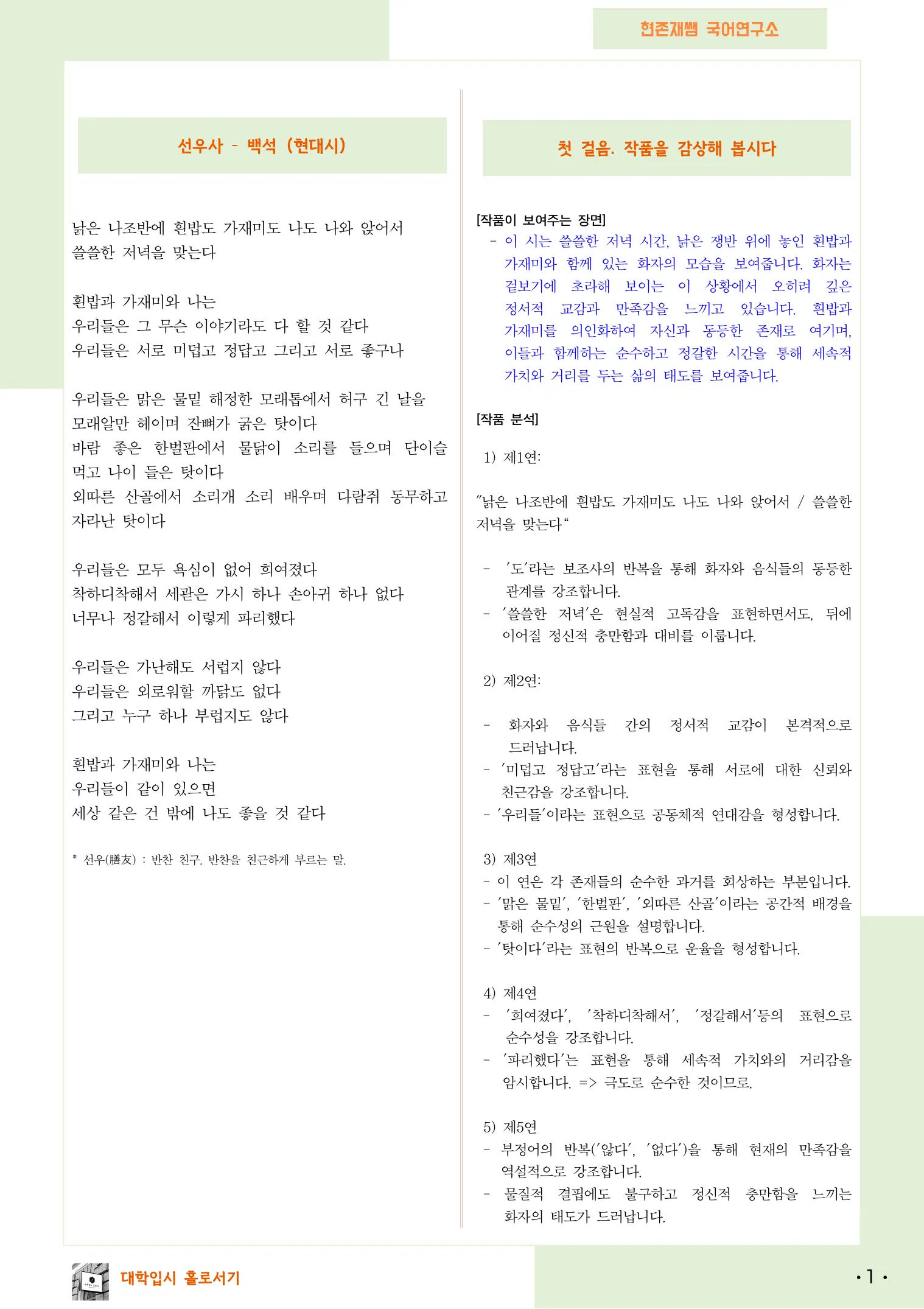 SOLVOOK 현존재쌤 국어연구소 '선우사 - 함주시초 4' 자료