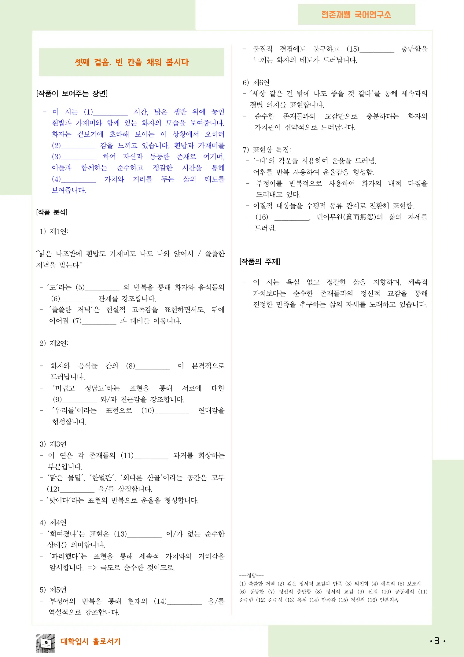 - 쓸쓸한 저녁'은 현실적 고독감을 표현하면서도, 뒤에 이어질 정신적 충만함과 대비를 이릅니다.