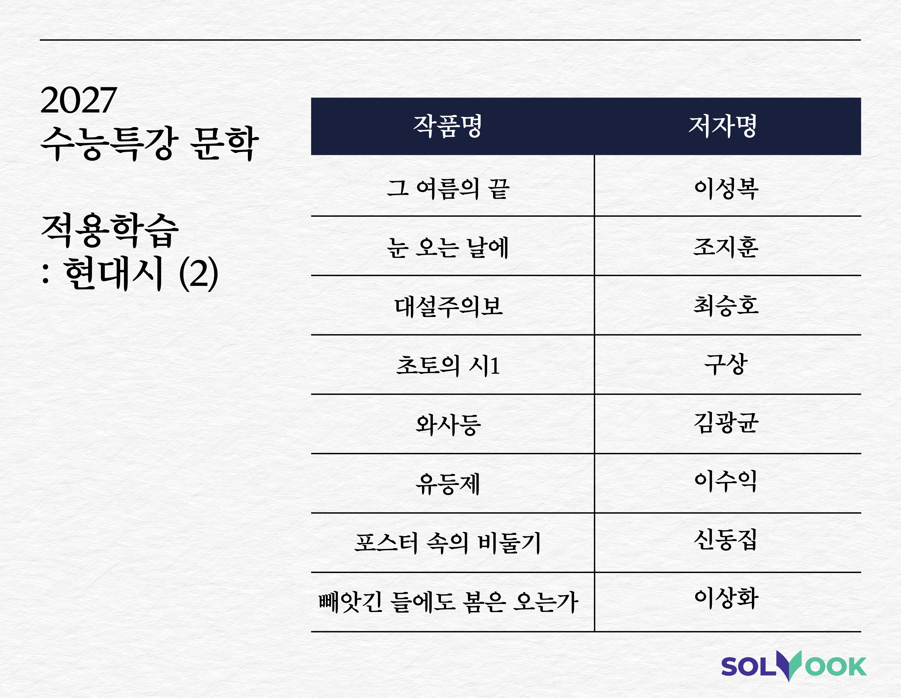 | 2027 수능특강 문학 수록 작품 리스트 2편 | 고전산문, 고전시가, 현대소설, 실전학습 1회, 2회 (1) | 2026.03.11 |